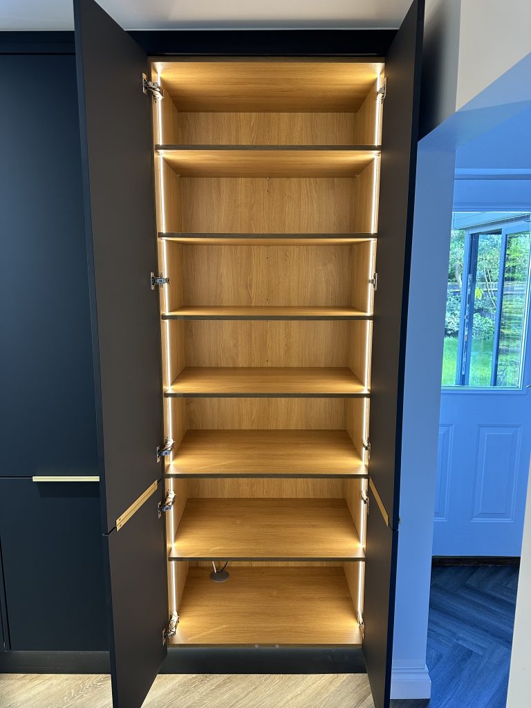 We also integrated LED strip lighting without visible fittings above the cabinet handles, with additional strips along the kickboards to give a soft glow, and inside the full height custom built pantry cupboard so every shelf is lit when you open the doors.