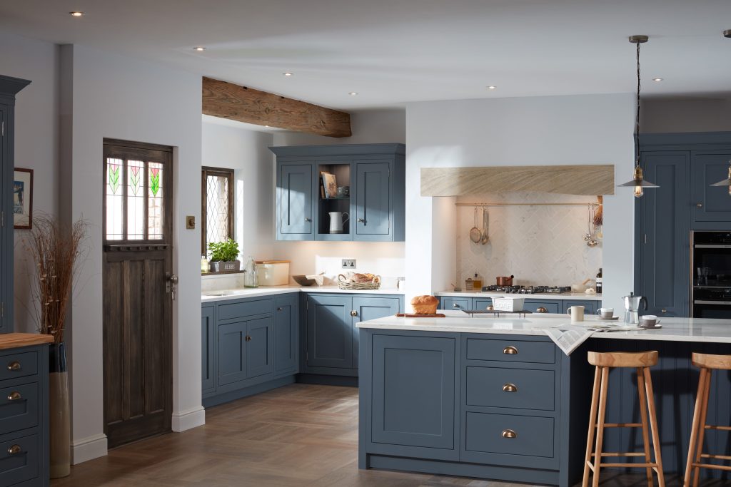• Dustier, paler blues: Dustier, paler blues are replacing deep navy as the go-to blue for kitchens, giving colour that feels relaxed instead of dramatic. Softer shades such as Cadet Blue or Ives Blue create an airy, easy-to-live-with feel, particularly when paired with porcelain tones and warmed up with touches of washed oak and softer metallic finishes.